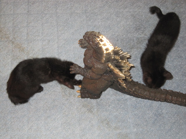 ゴジラVSキャッツ・その3(2010.2.20) しっぽに、かみつき攻撃だ! そういえば、モスラの幼虫もこのパターンで闘っていたね。 |