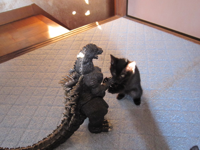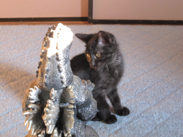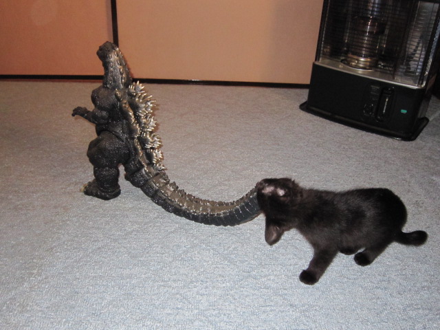 | ゴジラVSキャッツ・その1(2010.2.20) ゴジラ現る。動かすと、毛を逆立てて後ずさり。動かないとちょっかいを。なんだ、こいつ? |