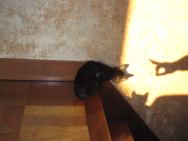 臨戦態勢(2010.2.20) 猫パンチを繰り出す体勢に入るアラン。影分身の術にはまっているとも知らず……。 |