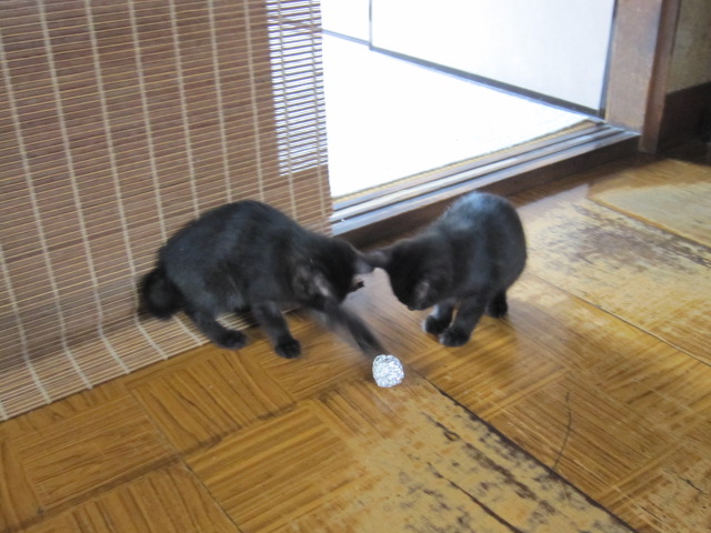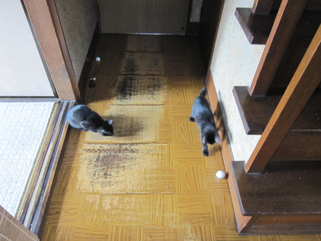 | ボールで遊ぶ・その1(2010.2.21) アルミホイルを丸めたボールに興奮。すり減った床は、二十数年前の先輩猫たちが駆けた跡。 |