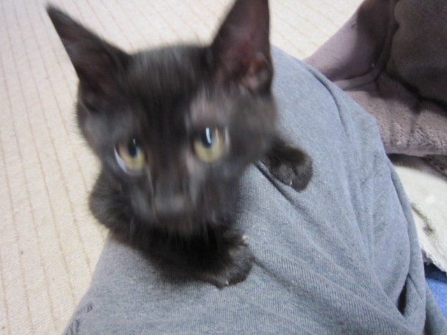 カメラマンの危機・その2(2010.2.27) 膝の上で寝ているところを撮ろうとしたら、がばっと起き上がって迫る。ひぇ〜、ごめん。 |