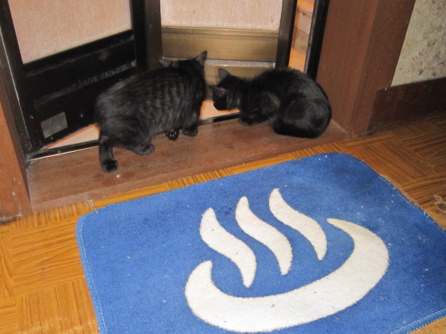| 温泉調査隊(2010.3.1) 風呂場が気になってしかたがない。恐る恐る覗いているけれど、濡れるのは、イヤ。 |