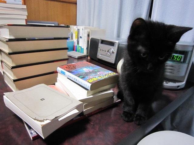 本に親しむ(2010.3.1) どれ読もうかなあ? ちょっと味見…。お客さん、食べないで! 文庫本の角がボロボロに。 |