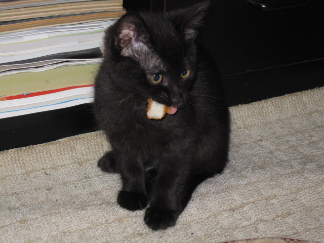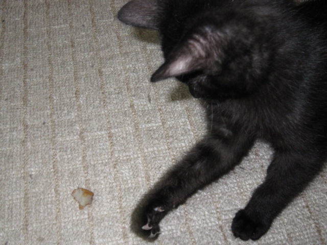 さつまあげと踊る(2010.3.3) 興奮のあまり、さつまあげのかけらをもてあそぶ。早く食べないと、ホコリまみれになっちゃうよ。 |