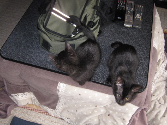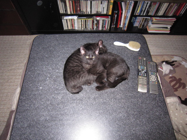 おはよう(2010.3.4) こたつに入って、なかよく寝ている。あ、起きちゃった。うるさいなあ。えー、もう朝? |