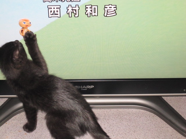 | どこまで行くの(2010.3.5) テレビの上を散歩。このあと、主電源スイッチを踏んで、消してしまいました。おいおいっ。 |