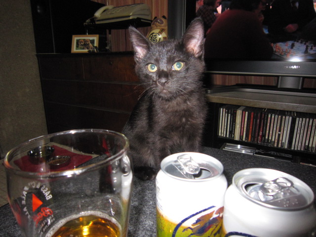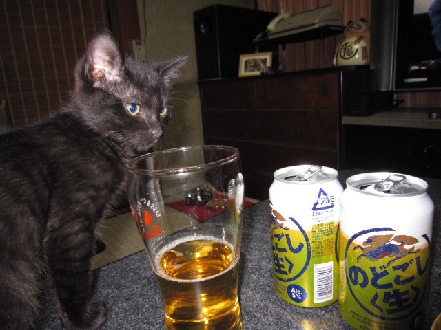 あ、ビールだ!(2010.3.7) 村長の晩酌につきあう。ビールに興味があるようす。だめだめ、未成年じゃろ? |