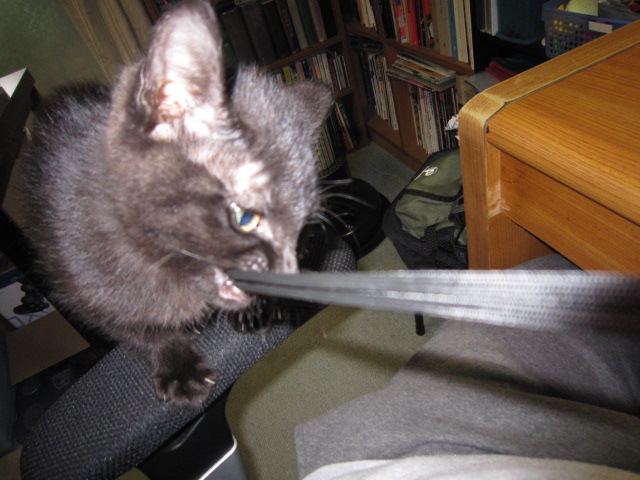 やっぱ、だめ?(2010.3.7) テーブルの反対側から攻めてみる。ちょっとなら、いいんじゃない? だめっ。 |