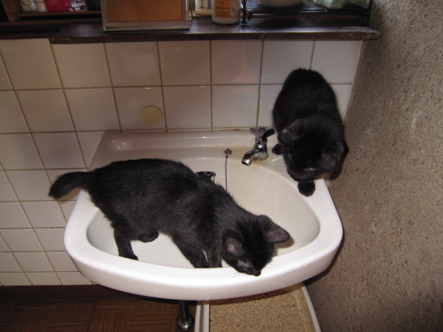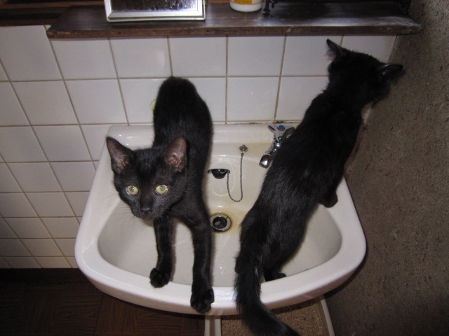 洗面台を磨く・その1(2010.3.14) 猫トイレを掃除する村長を踏み台にして洗面台へ。ここはオレたちが掃除するよ。あのねえ…。 |