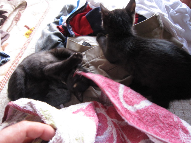 | 洗濯物をたたむ・その1(2010.3.14) 洗濯物が乾きました。よし、たたむの手伝うよ。いえ、気持ちだけでけっこうです。じゃまっ。 |