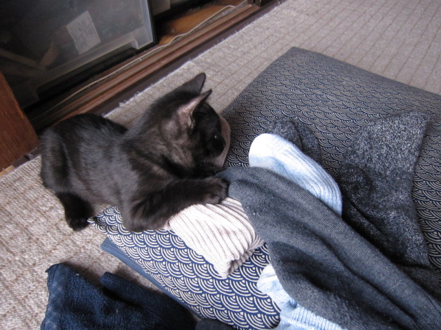 洗濯物をたたむ・その2(2010.3.14) まあ、、遠慮するなよ。靴下って好きだなあ。こら、そういう問題か? かじるなっ。 |