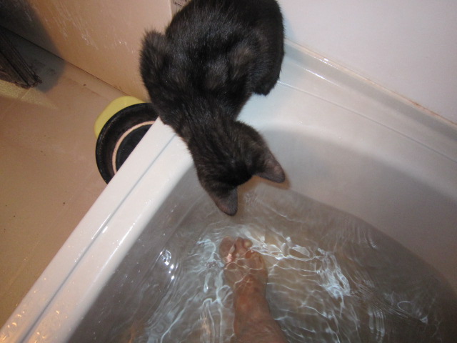 風呂場を探検・その2(2010.3.15) あ、変な魚が? 村長の足です。そんなもの見て、なにが楽しい? しかし、村長もアホですね。 |