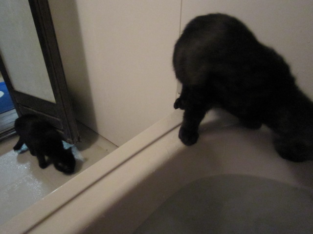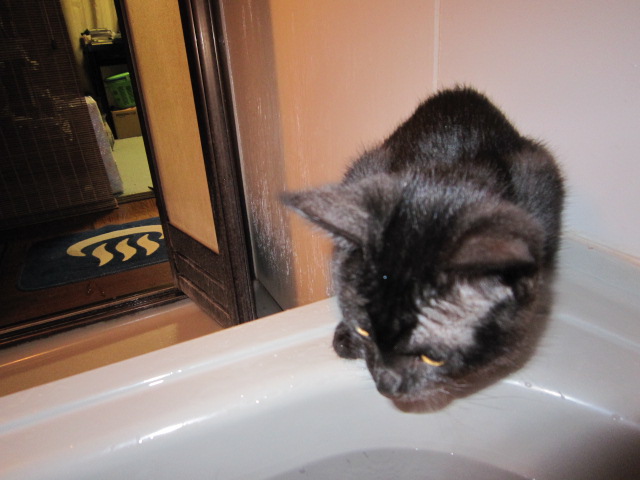 | 風呂場を探検・その1(2010.3.15) 村長の入浴を見学。アランが積極的、エドガーは恐る恐るうしろから。おまえたちも入る? |
