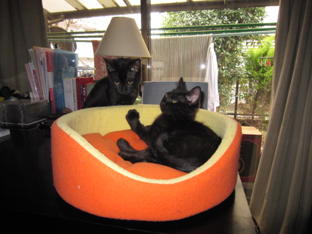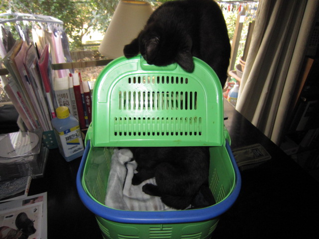 ワクチン接種の朝(2010.3.19) 二回目の接種日。なぜか、すすんでバスケットに入る二匹。どこへ行くか、わかってない。 |