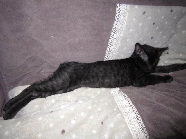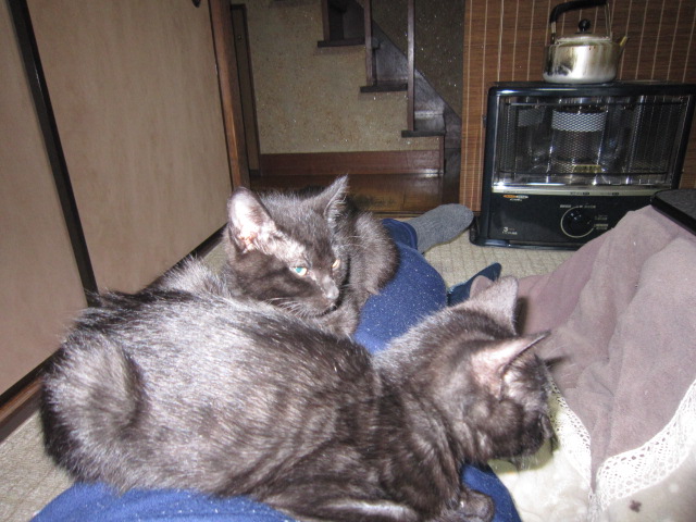 | 伸びる(2010.3.17) 人間が思うほど、寒がりではない。暑くなるとこたつから這いでて、ながーく伸びてます。 |