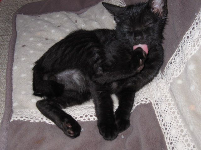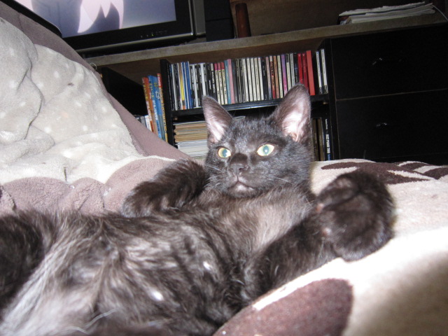くるしゅうない、近う寄れ(2010.3.18) クッションで、ふんぞりかえっております。なんだか、偉そうなポーズだねえ。 |