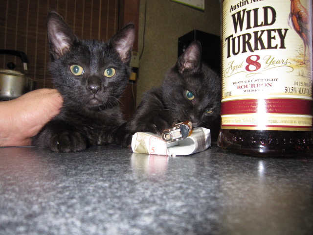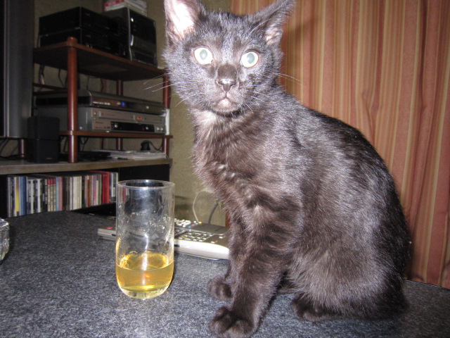 あ、やべっ!(2010.3.18) ちゃぶ台の上では、こっそりバーボンにありつこうとする奴が。見とがめられて、焦る。 |
