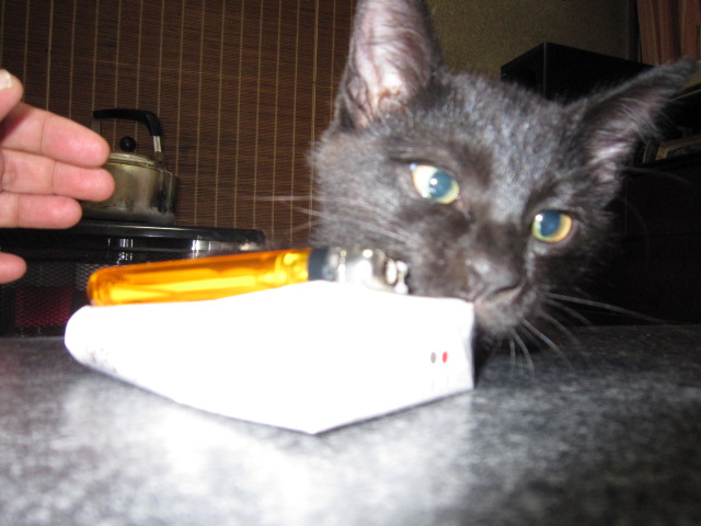 お客さん、そろそろ閉店です(2010.3.18) 二匹そろって、ちゃぶ台に。えー、もう終わり? 煙草一本、いいかな? だめっ。 |