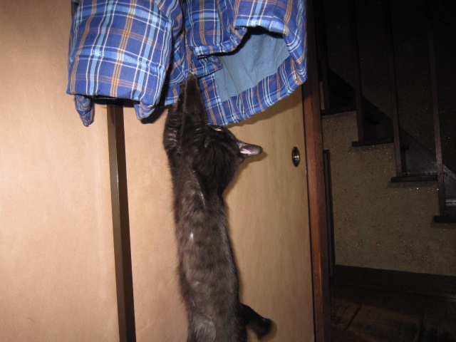| ぶらさがる(2010.3.18) 飛びついたまではよいのですが、爪がとれなくなっちゃったよー。自分でなんとかしなさい。 |