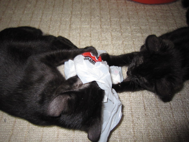 | 村長のおみやげ・その1(2010.3.20) 会合で浅草に出た村長が、おみやげを買ってきた。奪いとって、まずポリ袋に熱狂。 |