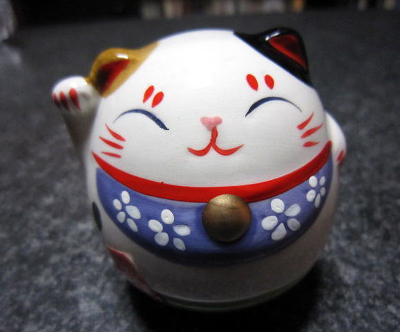 村長のおみやげ・その2(2010.3.20) おみやげは招き猫の起きあがり小法師。鈴が入っていて、音もする。かわいいねー。どう? |