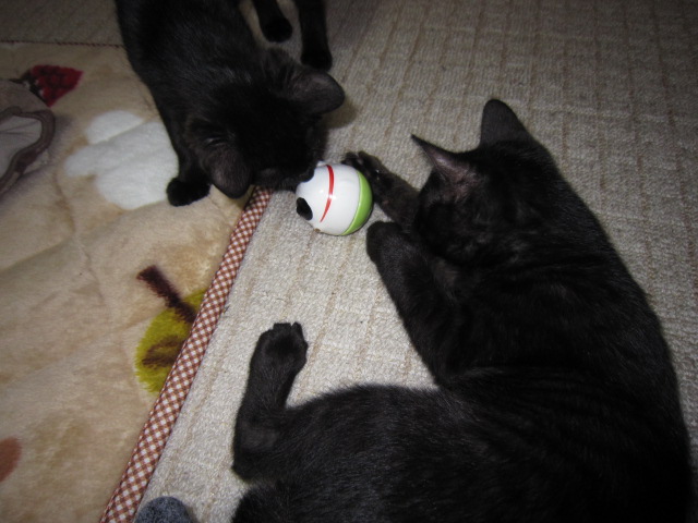 村長のおみやげ・その3(2010.3.20) 二匹は大喜び。もうすこし、優しくできない? なんか、福が逃げるような気がするぞ。 |