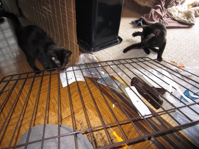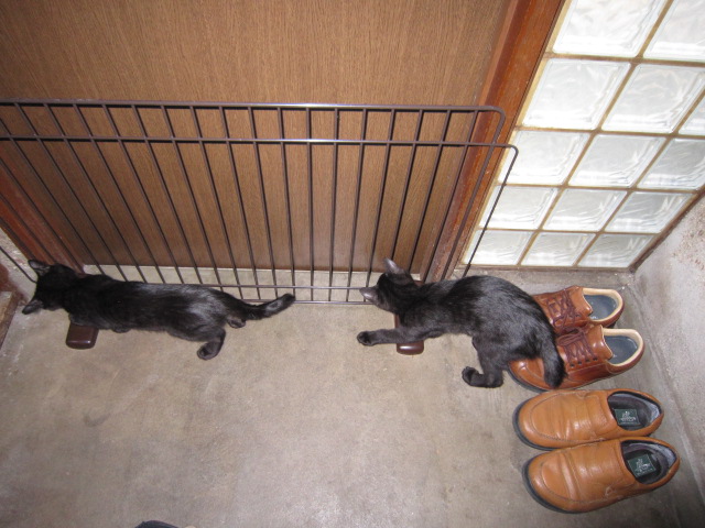 | 新兵器・ペットフェンス・その1(2010.3.21) 玄関からの脱走阻止、ペットフェンスを組みたてる村長。例によって、よけいな手伝いが。 |