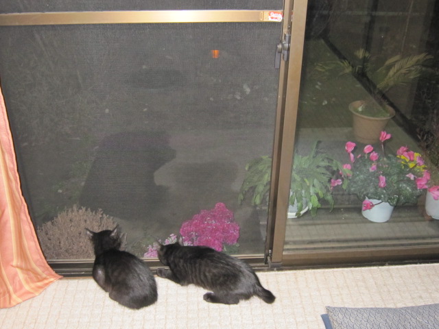 新兵器・網戸ロック・その2(2010.3.21) 風を受け、二匹も嬉しそう。あ、屋外への興味をあおったかも。網戸を破られたら? |