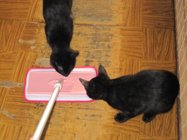| 新兵器・モップ(2010.3.22) ホコリをたてる、トイレの砂をこぼす。そんなときのためのモップ。二匹もお気に入り? |