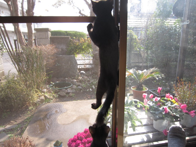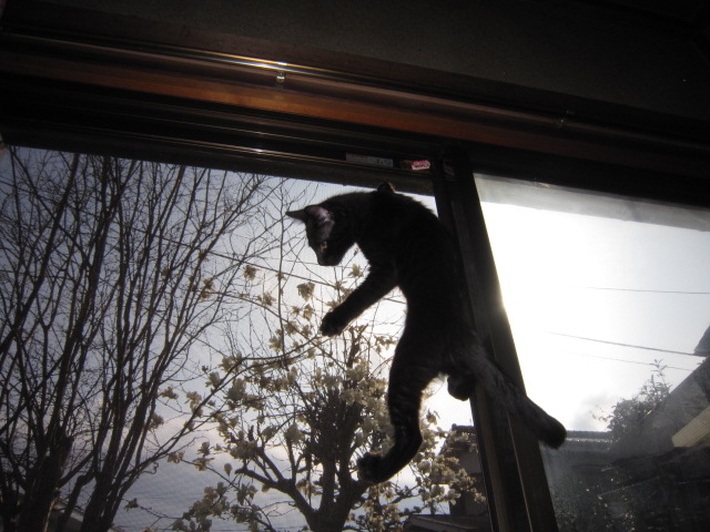 スパイダーマン・その2(2010.3.22) 窓のてっぺんまで登ってしまう。へぇ、クモザルみたいだなあ、って、感心してる場合? |